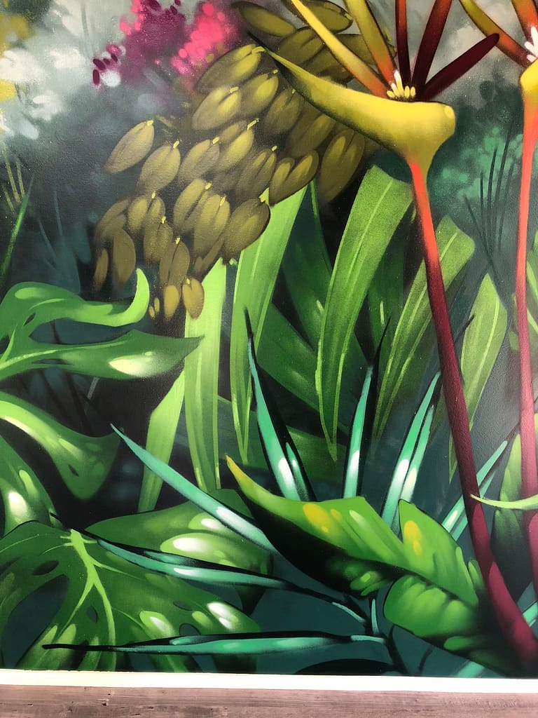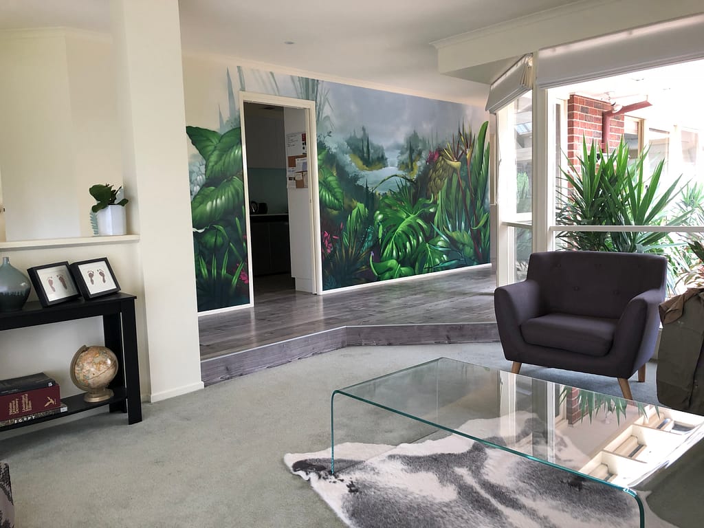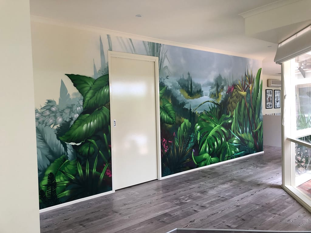Why hang a picture…when you can commission an entire mural! That was our client’s thinking when he approached us to design a show-stopping piece for his lounge room wall. He knew his wife was a big fan of our rainforest murals, so decided to surprise her by commissioning one for their renovations. Over a weekend he gave us his house while he wined and dined his wife on a romantic getaway. We set to work completely transforming their space. They had absolutely no idea what they’d be walking back to, but thankfully they loved it, later commissioning another painting from Steve to hang on an adjoining wall. Such a fun project – thanks guys! Also – PHEW!