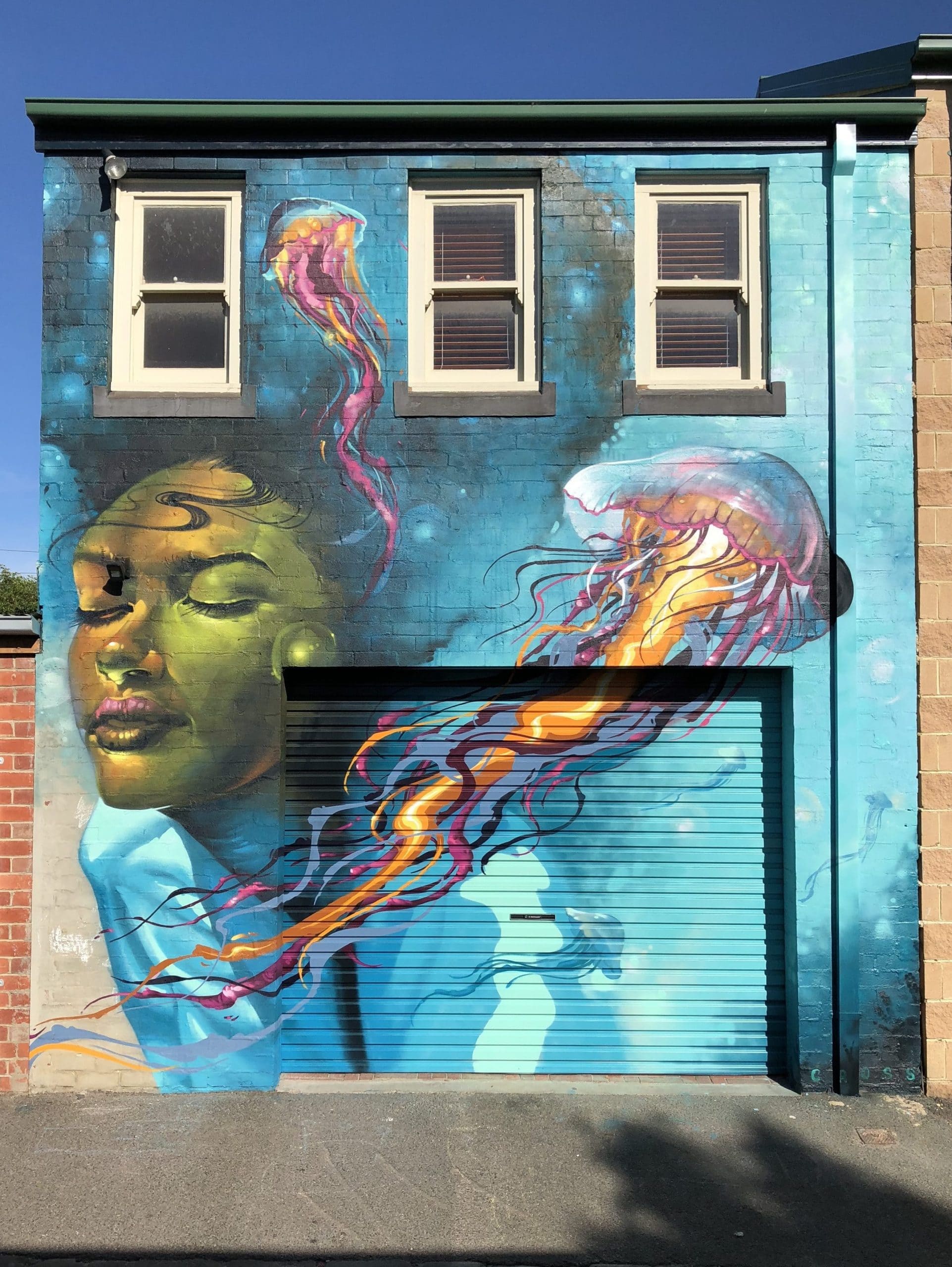 Sometimes you just need a giant floating jellyfish on your back wall! And that’s exactly what our lovely inner-city Melbourne clients got when they approached us to design a two-storey mural for their garage, which backs onto a secluded laneway. This out-of-the-way spot is a meeting spot for neighbours, whose kids converge in the lane to play, hang out and get up to mischief. It’s a hang-out spot for their parents too, who regularly catch up on a Friday evening for a post-work wine and a chat. Our clients wanted their mural to be a gift of sorts to their friends from the lane. They had no stipulations, other than that they wanted the piece to be fun, friendly and beautiful to look at. We think we delivered! We adored working on this project and are pleased to say we are now considered honorary Laneway members!