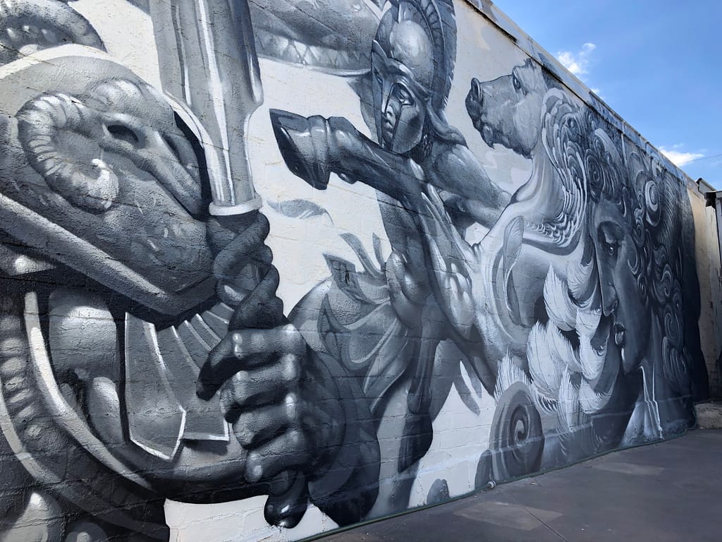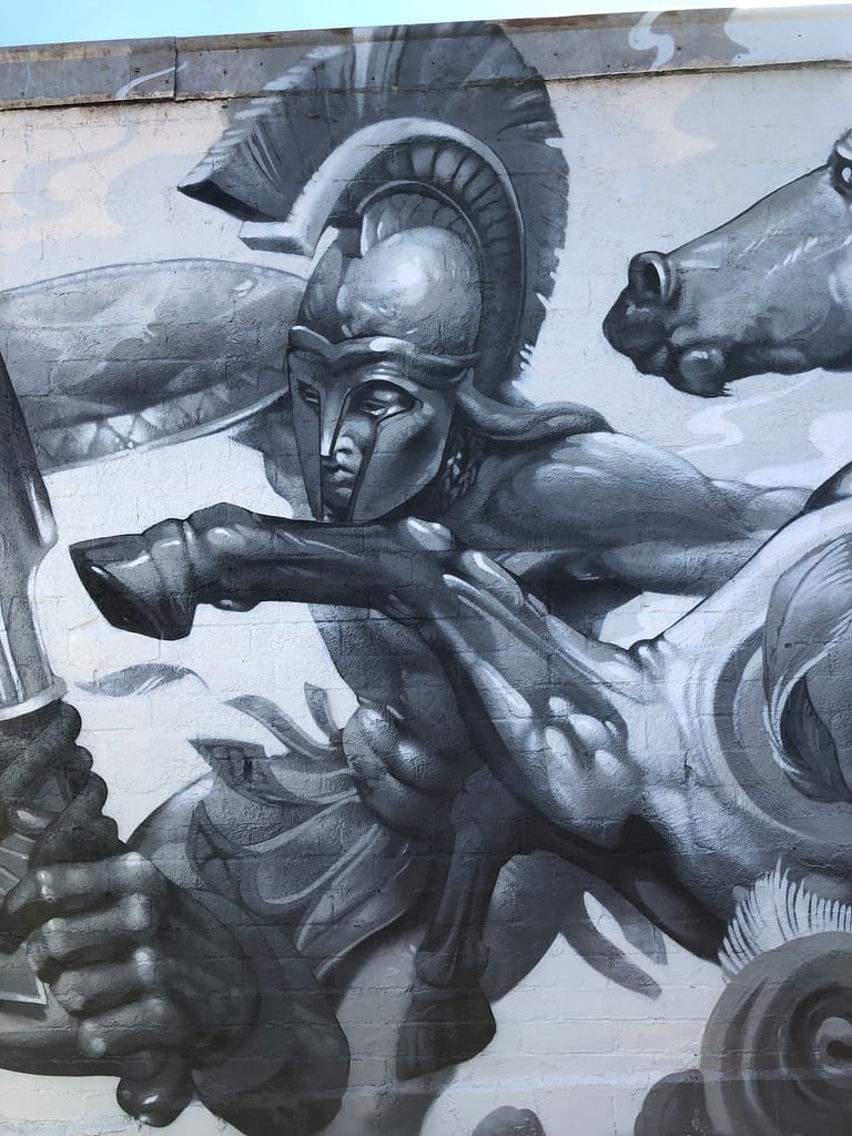 Spartans, assemble! This mural was for a private client in Melbourne. Proudly Greek, she wanted to pay homage to her heritage, and asked for Spartan warriors to be incorporated into her backyard mural. Talk about a fun brief! We set to work dreaming up a dynamic piece for her, in specified greys and whites. It looks incredible against the backdrop of her suburban garden. This was an absolute blast to work on – and not just because of all the delicious Greek delicacies Roula gave us while we worked. Oh, and she’d also just brought home her gorgeous little kitten, who kept Steve company while he worked. Swoon!