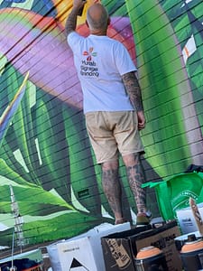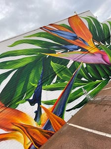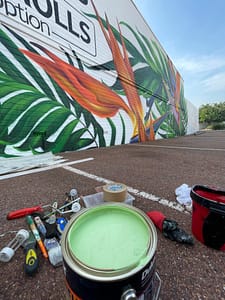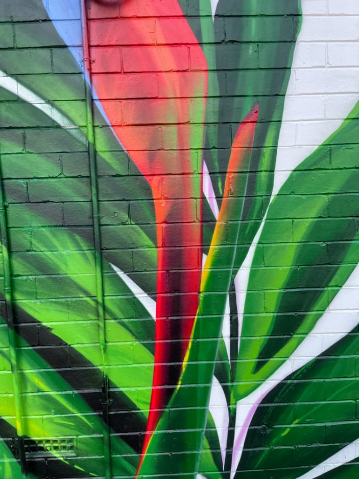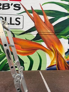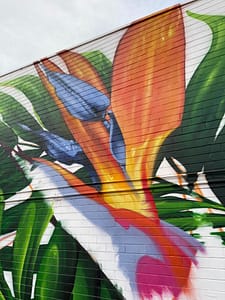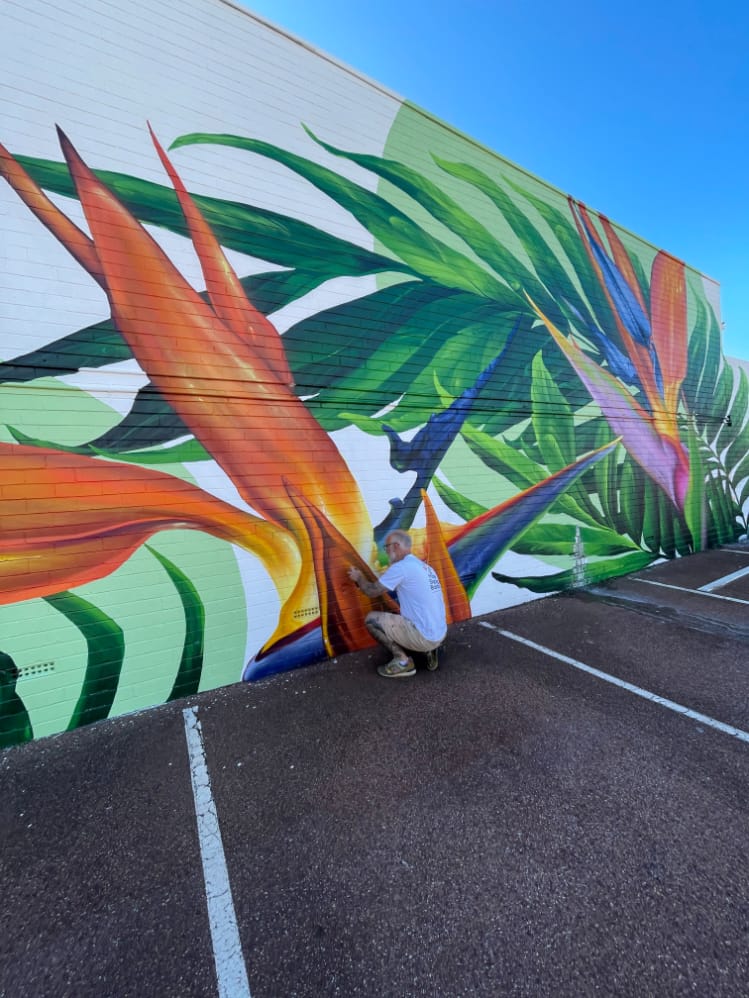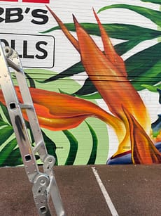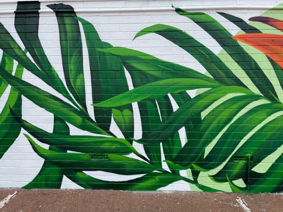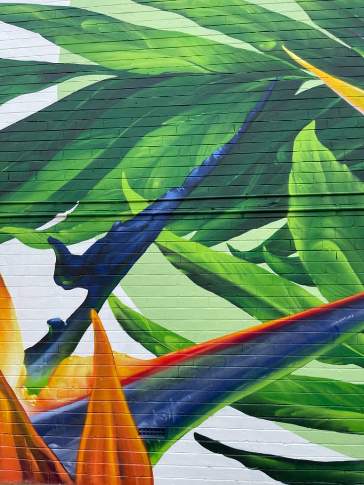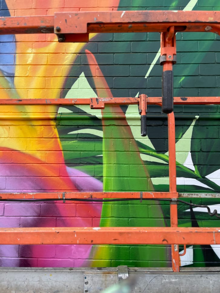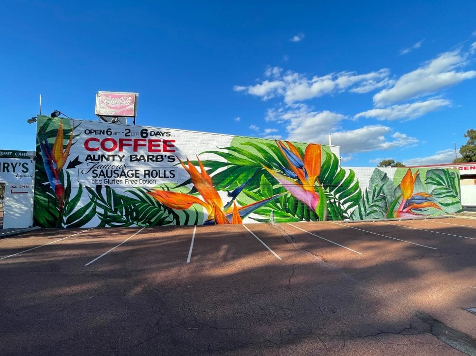 This mural has a very special place in our hearts – it’s our first commissioned piece since arriving back in Perth in 2020! The City of Melville put a call-out for a large-scale mural, to serve as both a point of interest locally, and as a deterrent for graffiti. We submitted this impacting design, which features some truly spectacular Strelitzia and jungle flora, and it was a hit with both council and the building’s owner, who adored its vibrancy. Situated on the corner of Stock Road and Leach Highway in Melville – one of the area’s busiest intersections – it’s since become something of a local landmark, popular both with motorists and passing foot traffic. And yes, we did consume a LOT of sausage rolls during the making of this epic mural. Thanks Aunty Barb!