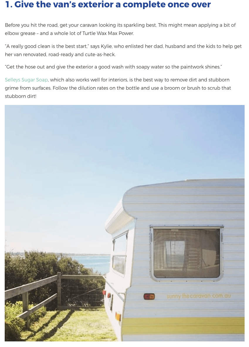 Selleys approached us in 2020 to work with them providing instructional content for their website. This piece is a fun ‘How to Renovate a Caravan’ blog post we crafted in collaboration with the lovely folk behind popular Instagram site, ‘Honey I Bought A Caravan.’ Clare interviewed the van owner, getting her take on how she managed to totally re-imagine her gorgeous mid-century van into a beautiful Insta-worthy vacation location – using Selleys products. We love how the page came together. You can read the blog post here.